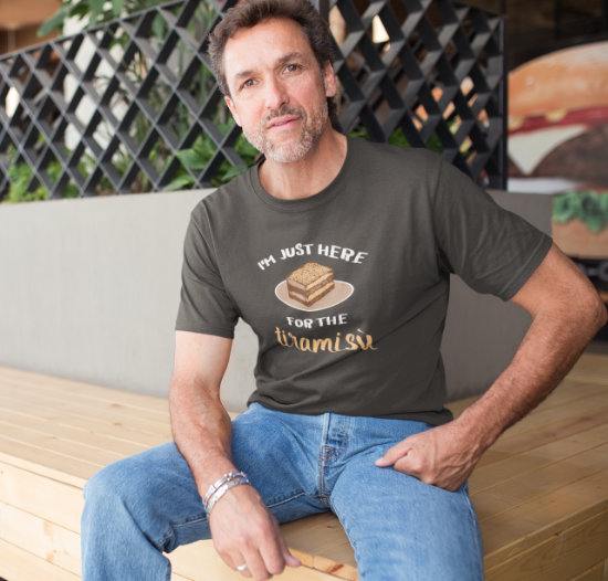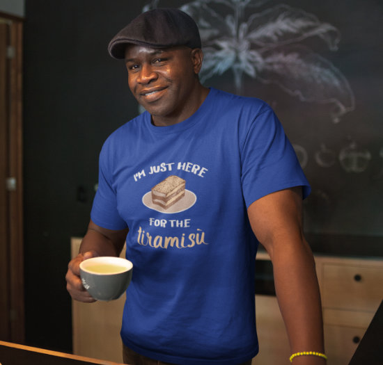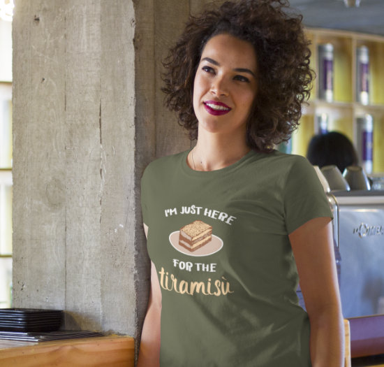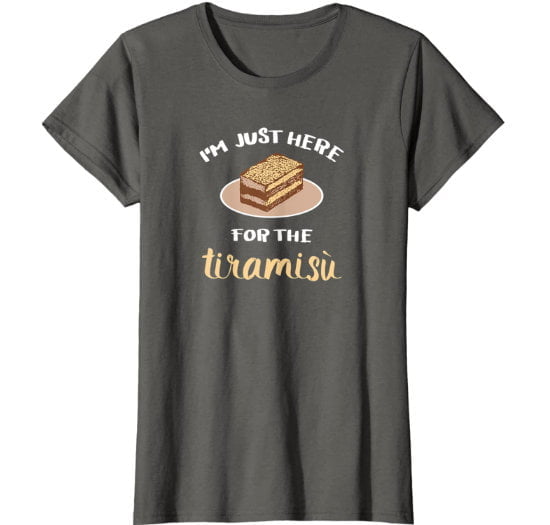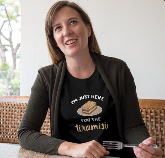 Dedicated to those who cannot live without this special dessert: “I’m just here for the tiramisù”. Might be fun to wear at your favourite Italian restaurant.
